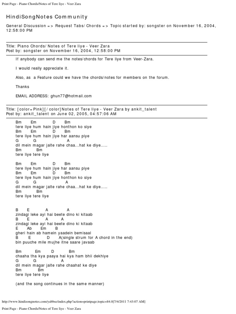 Print Page Piano Chords Notes Of Tere Liye Veer Zara