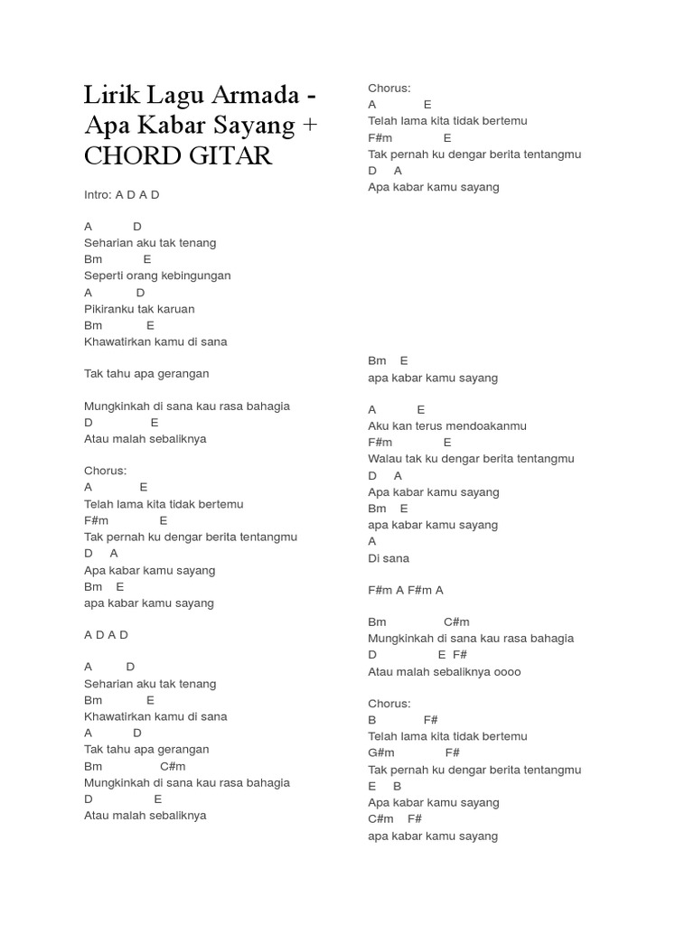 Lirik lagu apa kabar sayang vicky salamor Apa Kabar sayang Beta Paling rindu par mau telpon se SMS BBM deng Massanger se Sakarang ini Maka. Tunggu ale nona kalo mo pulang kasi kabar dapat ka seng. Chord Gitar dan Lirik Lagu Titip Rindu Buat Ayah - Ebiet G Ade Kunci Dasar A Mudah Dimainkan.
