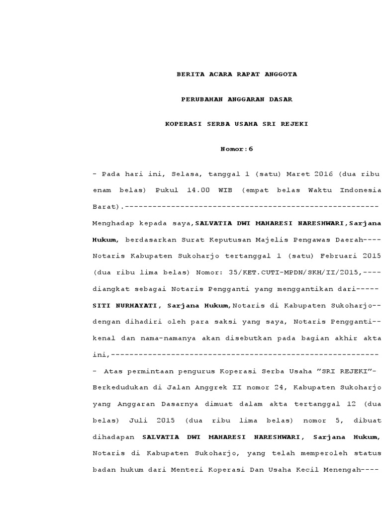 Akta Perubahan Anggaran Dasar Koperasi Berita Acara Fix
